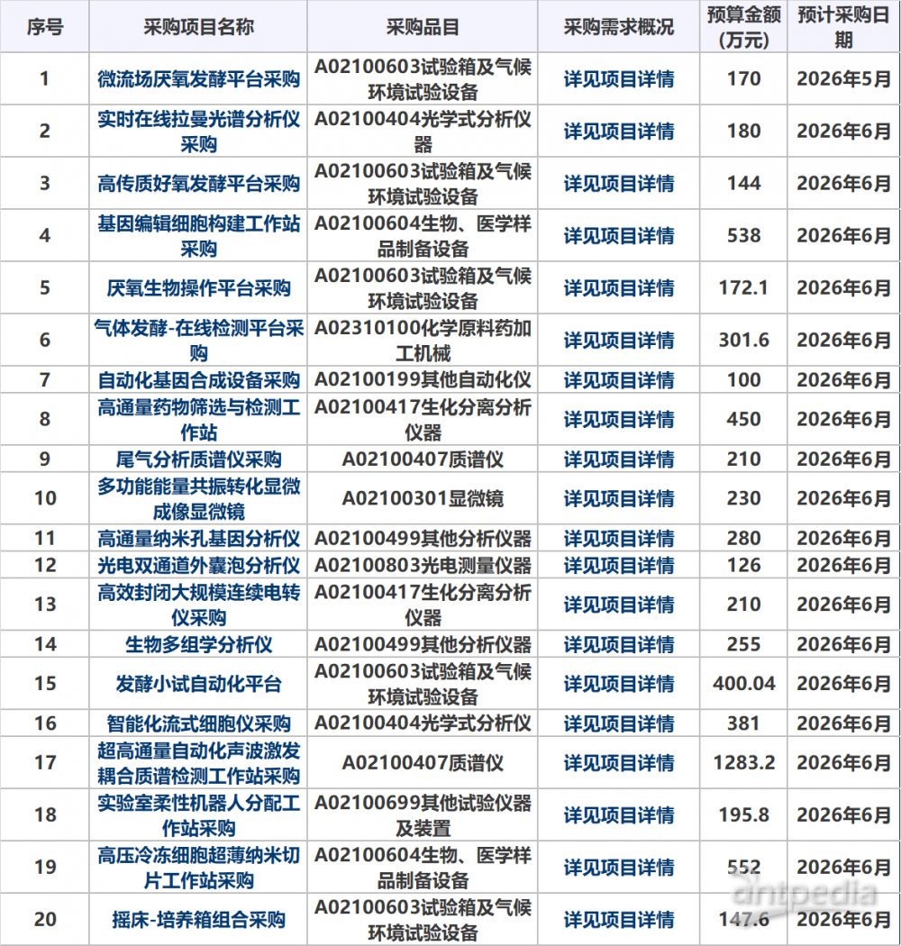 近日,大连理工大学发布 2026 年5至6月政府采购意向,涉及 20 个项目,总预算达 6326.34 万元,预计采购日期集中于 2026 年 5-6 月。本次采购涵盖微流场厌氧发酵平台、实时在线拉曼光谱分析仪、基因编辑细胞构建工作站、超高通量自动化声波激发耦合质谱检测工作站等设备,涉及光学分析、质谱检测、样品制备、生化分离等多个品类。