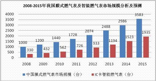 根据中国计量协会的相关数据,我国目前约有100家燃气表厂,2008年总产量为1000万台,每年的复合增长率约为20%。具有中国特色的智能膜式燃气表,以IC卡预付费为主导产品,总量逐年上升,已占膜式燃气表总量的30%以上。预计2015年我国燃气表总产量为3583万台,智能燃气表总产量为1935万台。