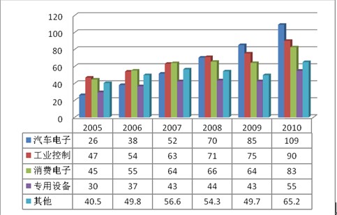 据高工物联网统计,2010年我国传感器整体市场规模达到402亿元(中国电子信息产业发展研究院测算为905 亿元)。汽车电子产品和工业控制领域是最主要的应用市场,市场规模分别达到109亿元和90亿元,占据了27.2%和22.4%的市场份额。排在第三的是消费电子,传感器市场规模达到83亿元,占比20.7%。