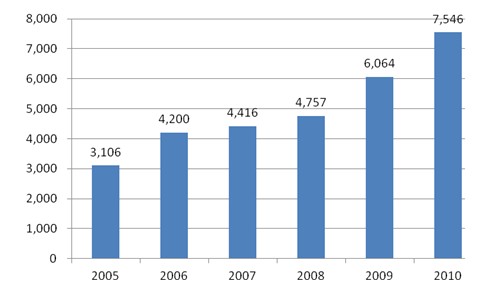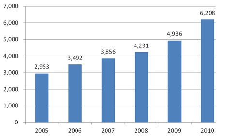 图14:2005-2010我国消费电子行业传感器销售额(亿元)