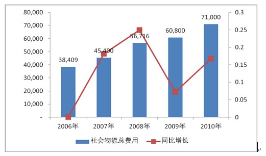 2006-2010年我国社会物流总费用由38409.48亿元增长到71000.00亿元,年复合增长率16.60%,物流业在我国经济的发展中扮演起越来越重要的角色。