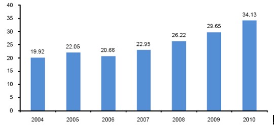 “十一五”期间我国物流基础设施的不断建设和完善,物流业取得了快速的发展。2004年我国物流业固定资产投资总额为0.67万亿元,到2010年投资规模已经达到3万亿元,年复合增长率达到28%;2004年我国社会物流总额为40万亿,到2010年已经达到125万亿元,年复合增长21.74%。
