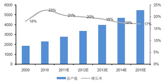 传感器是安防设备的核心器件,未来传感器在安防领域的市场规模增速将和安防行业的产值增速同步,预计未来5 年年均增长在20%左右。根据我国安防行业“十二五”发展规划(审议稿),到“十二五”末期实现产业规模翻一番的总体目标,年均增长率达到20%左右,2015 年总产值达到5000 亿元;而在2010 年,我国安防行业总产值达到2,300 亿元,年增长率23%。