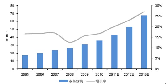 根据赛迪顾问《2009-2010 年中国社区安防电子市场研究》预测,2013年我国社区安防电子市场规模将达到517亿元,相比2009年统计的313亿元,4年复合增速为13.4%。
